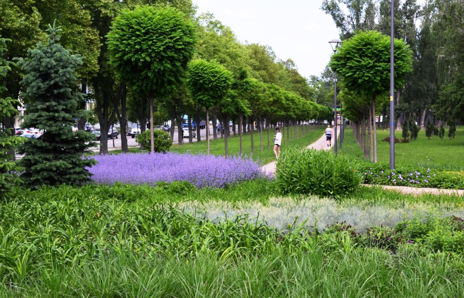 Майже рік тому у парку "Веселка" в Шевченківському районі були висаджені масиви багаторічників - 13 тисяч рослин на 1000 кв. м. За рік більшість з них вже розрослися, утворюючи зелені килими.