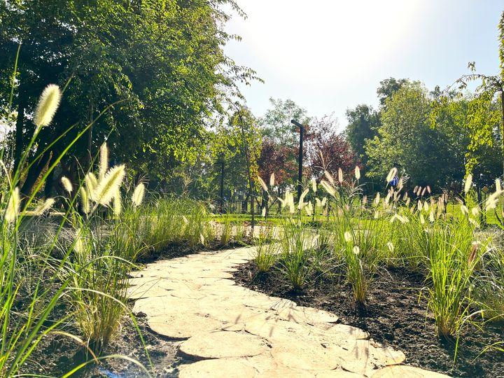 У квітнику поєднані декоративні злаки з багаторічними рослинами, а саме: пеннісетум лисохвостий, міскантус китайськи, перовскія лебедолиста, очиток(седум) ‘Matrona’.