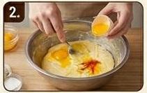 2. Замішайте жовтки з цукром. Додайте масло, шафран та опару. Поступово вмісіть борошно.
