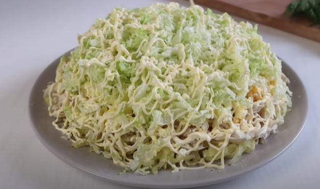 Наступним шаром викладіть варені яйця, натерті на крупній тертці. Знову сіль, перець та мойонез. Далі - пекінська капуста. Використовуйте половину капустини, але ріжте її не вздовж, а поперек і беріть найніжнішу частину качана. Ріжте капусту тоненькою соломкою. Викладайте капусту на яйця з майонезом і ще раз змащуйте майонезом. Верхнім шаром присипте салат натертим тведим сиром на дрібну тертку. Прикрасіть сіточкою з майонезу і зеленню. Залиште пропитатися на годину та їжте.