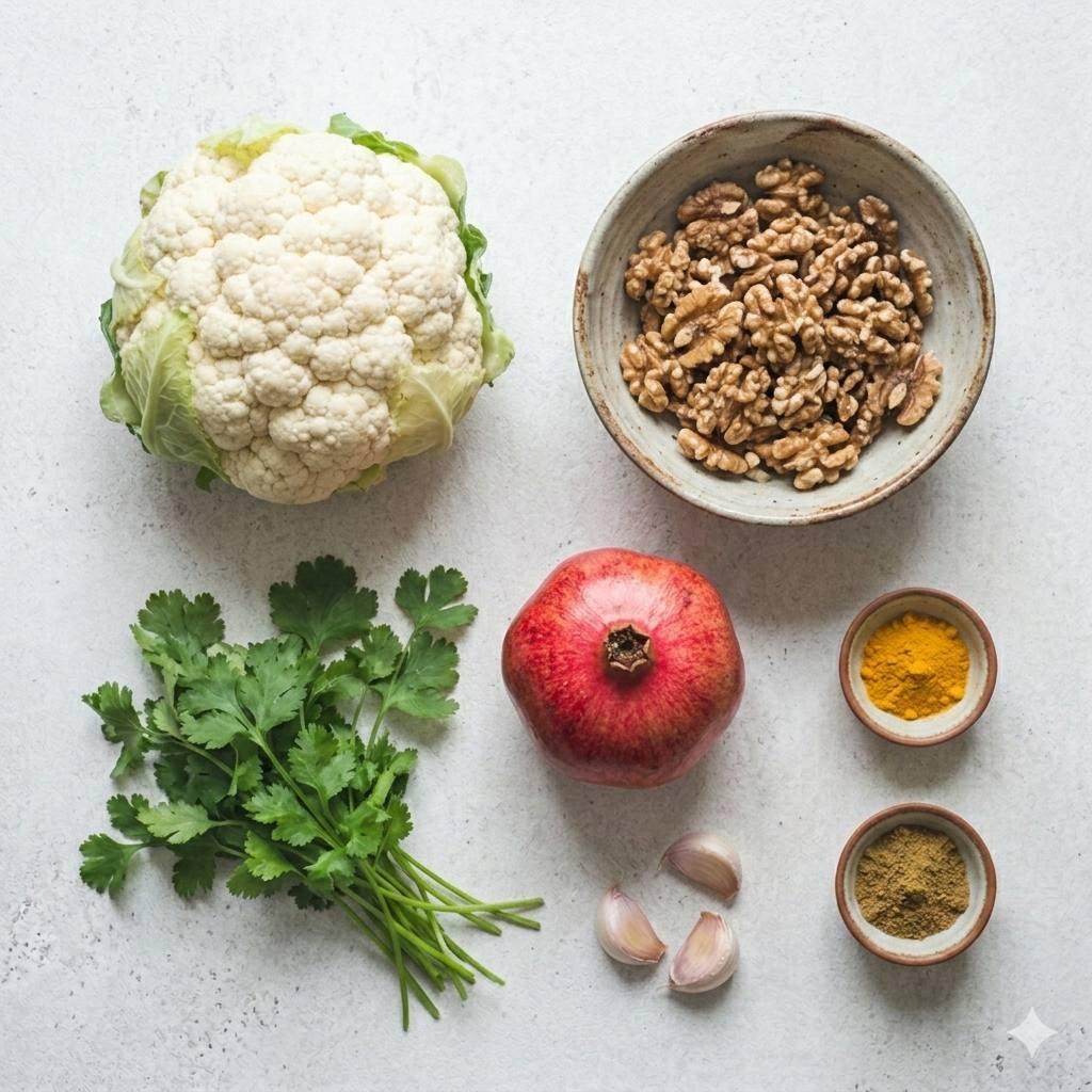 1. Розберіть капусту на суцвіття, збризніть олією і запікайте в духовці при 200°C близько 20 хвилин (вона має стати м'якою, але злегка хрусткою). Для соусу у блендері збийте горіхи, часник, спеції та бульйон до стану густої сметани. Викладіть теплу капусту в боул, рясно полийте горіховим соусом. Посипте гранатом та зеленню.