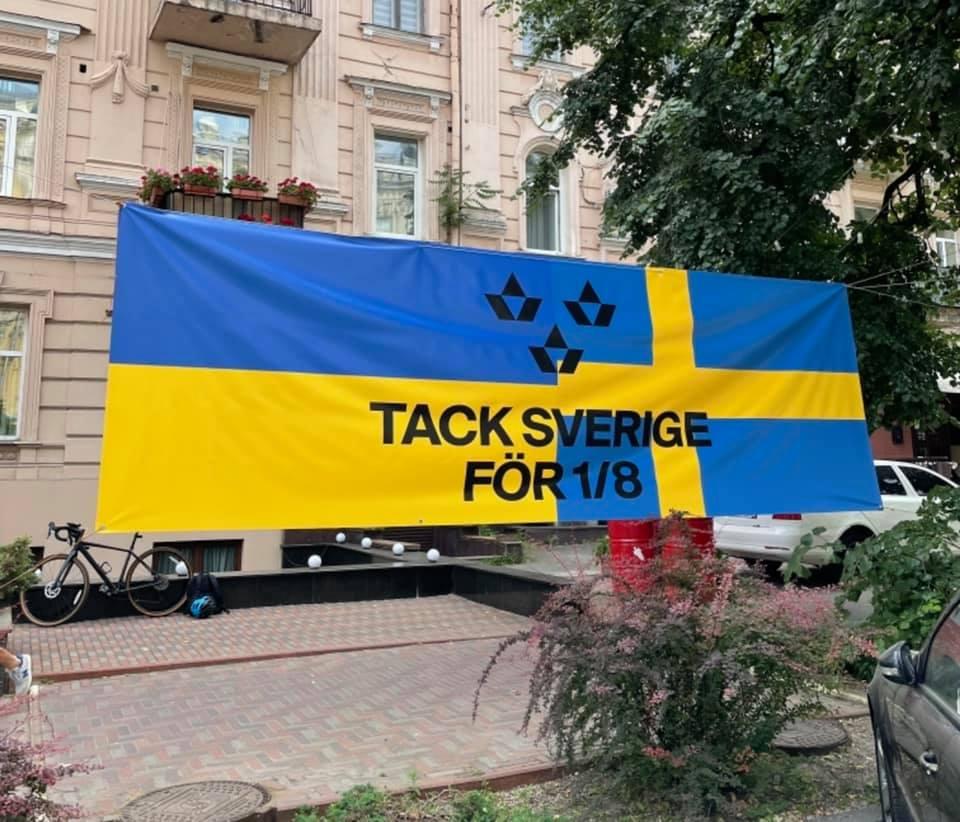 Зокрема, на вулиці Івана Франка тепер красується банер з написом «Tack Sverige for 1/8», що в перекладі – «Спасибі, Швеціє, за 1/8» (українська збірна вийшла в плей-оф завдяки перемозі Швеції у матчі з Польщею).