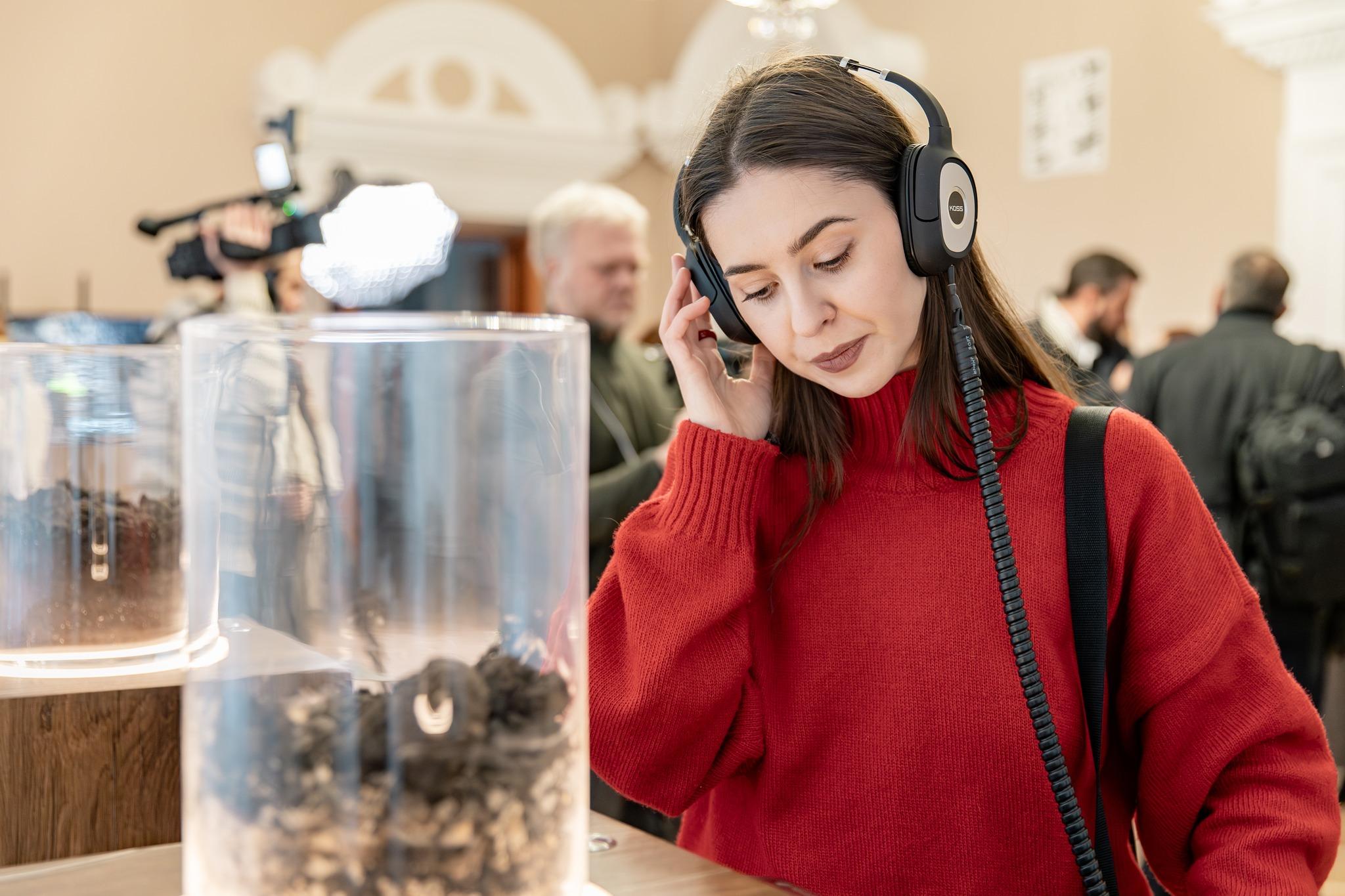 Десять прозорих циліндрів із ґрунтом з регіонів, що постраждали від бойових дій, формують єдиний простір памʼяті. У кожній колбі — окрема звукова історія: саперів, які щодня знешкоджують вибухонебезпечні предмети, фермерів, які повертають до життя зруйновані поля, дітей, які знову знаходять шлях додому.